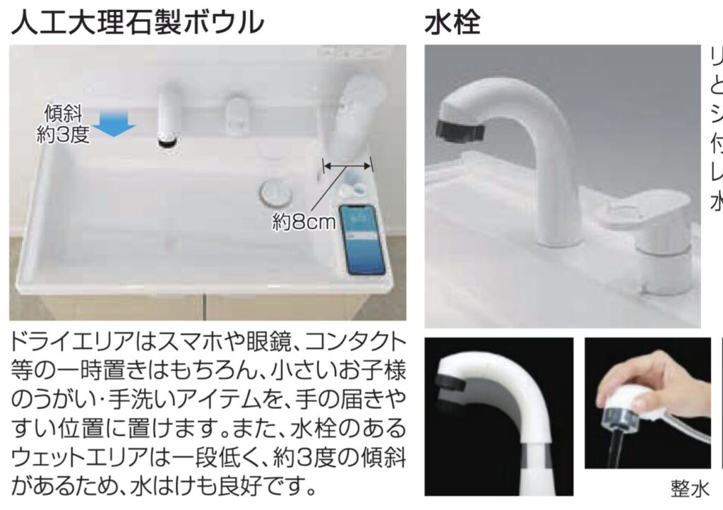 水栓まわりに水たまりができない壁出しタイプの「すきっと水栓」や、水はねを防ぐ「ハイバックガード」、小物の一時置きに便利な「アラウンドステップ」など、清掃性と利便性を高める工夫が満載。工事費込みで13万円台〜(幅75cm)の価格帯で、日常の快適さと手入れのしやすさを重視する方におすすめです。