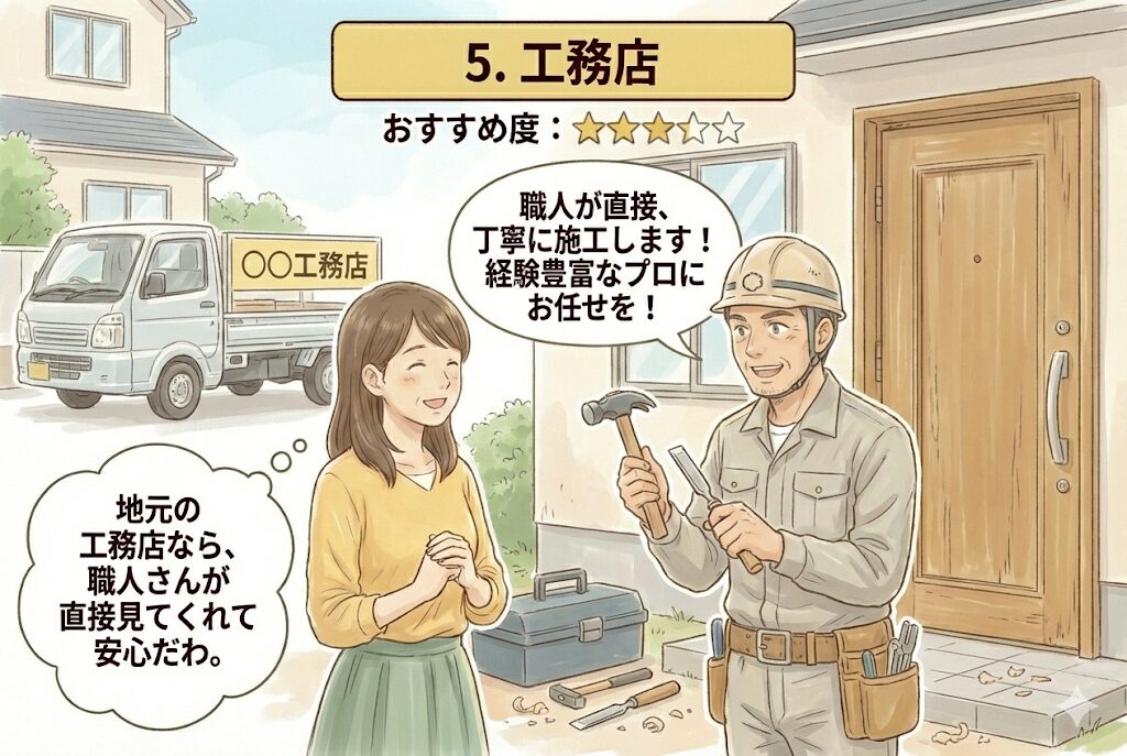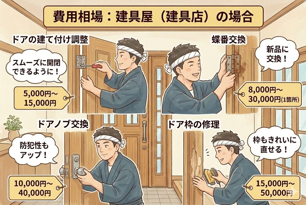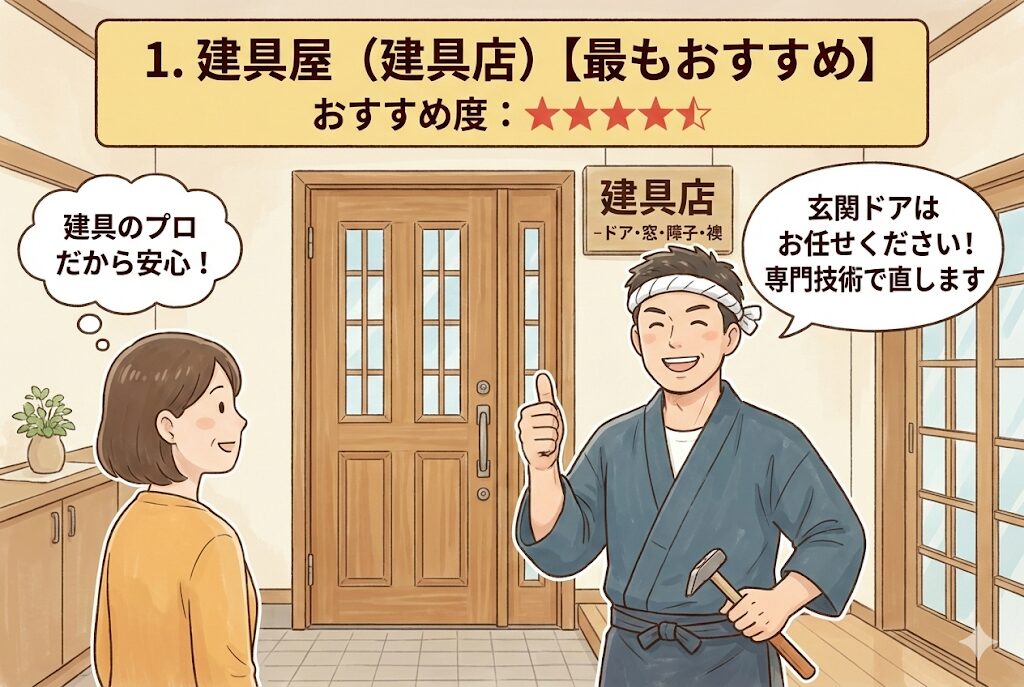 建具屋は、ドア・窓・障子・襖など建具全般を扱う専門業者で、玄関ドア修理において最も専門性の高い業者です。