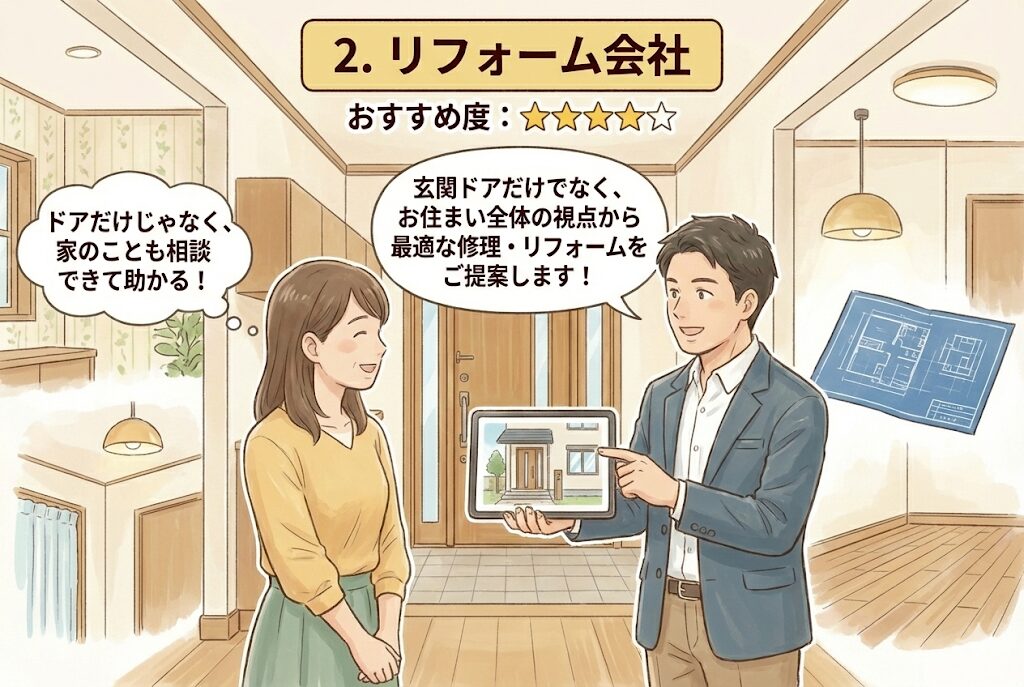 リフォーム会社は、玄関ドアだけでなく住まい全体を考えた総合的な提案ができる業者です。