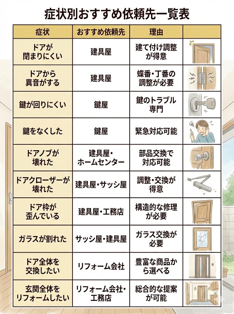 玄関ドアの修理は、症状によって最適な業者が異なります。適切な業者に依頼することで、費用を抑えながら確実な修理ができます。