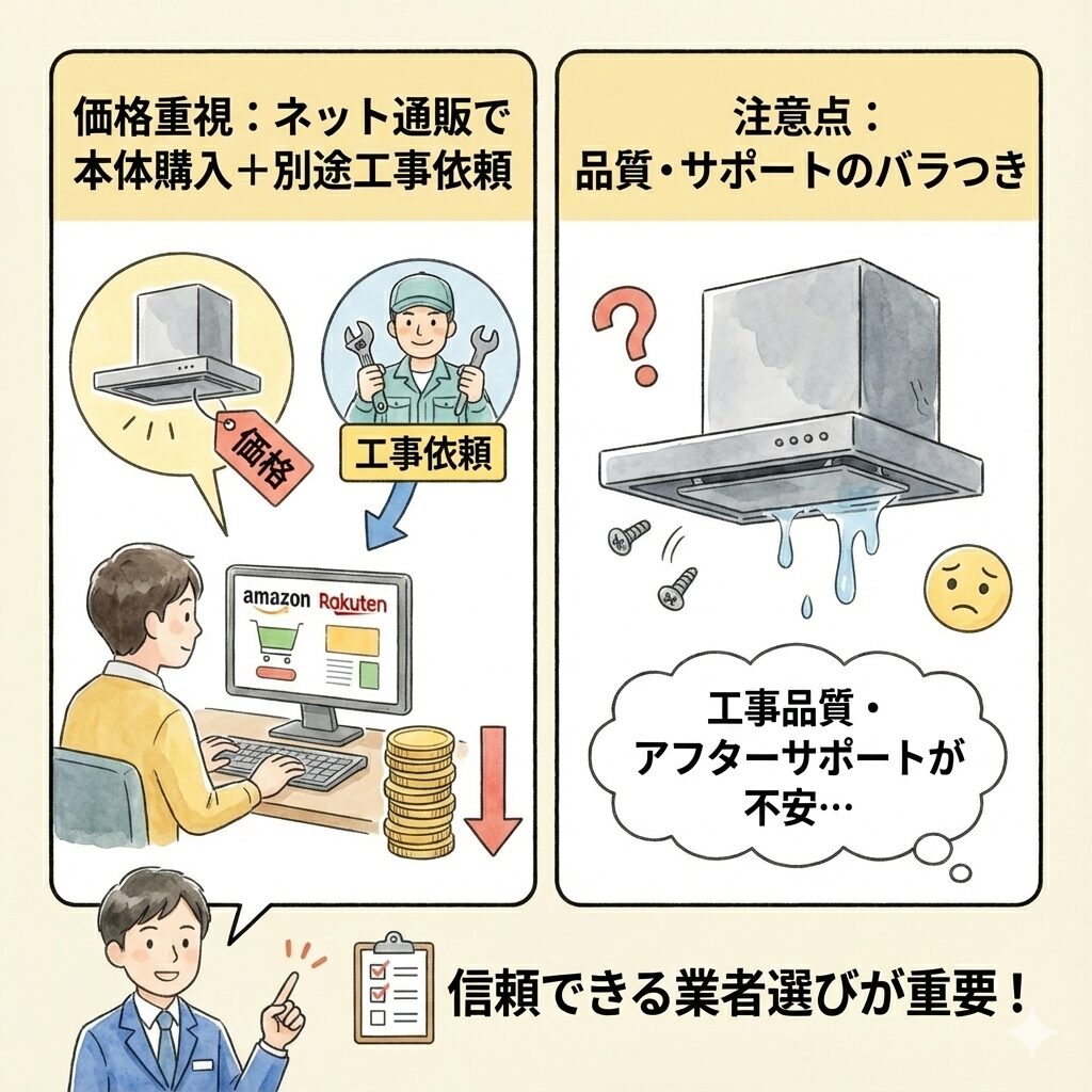 価格重視の方には、ネット通販で本体を購入し、別途取り付け業者に工事を依頼する方法もあります。ただし、工事品質やアフターサポートがバラつくこともあるため、信頼できる業者選びが重要です。