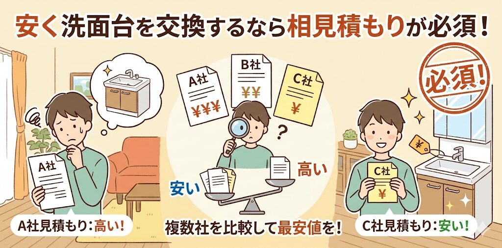 また、ホームセンターで販売されている洗面台は「お手頃な価格帯」の商品に限られているケースも多く、選択の幅が狭いです。より安く、より豊富な選択肢の中から希望の洗面台を選ぶために、少し面倒ですが相見積もりをしましょう。