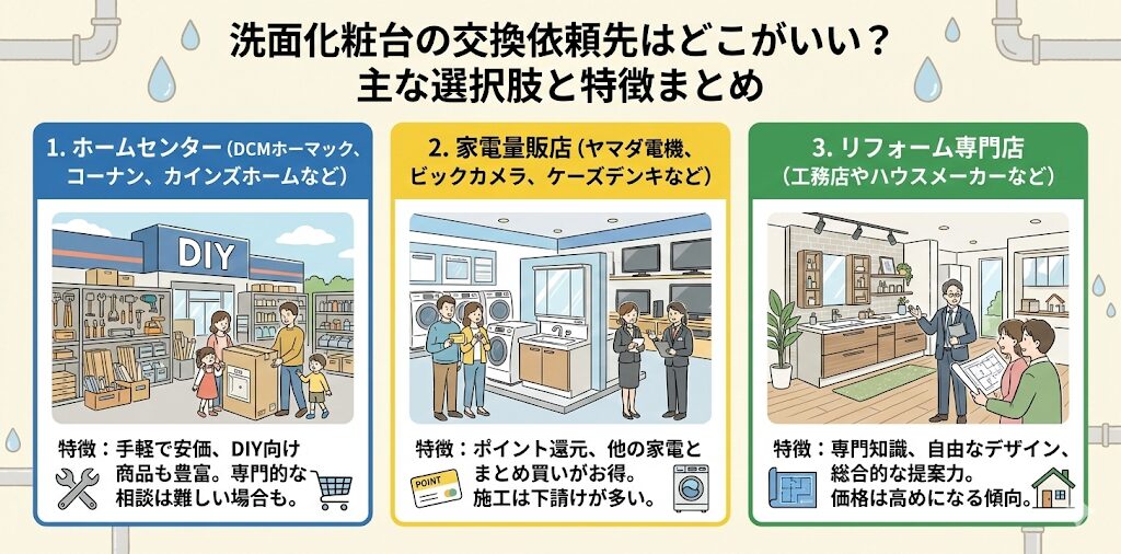 洗面化粧台の交換の主な依頼先には、ホームセンター、リフォーム専門会社、家電量販店、そしてメーカー直属の施工業者などがあります。それぞれの特徴を理解し、ご自身の優先順位に合った依頼先を選びましょう。