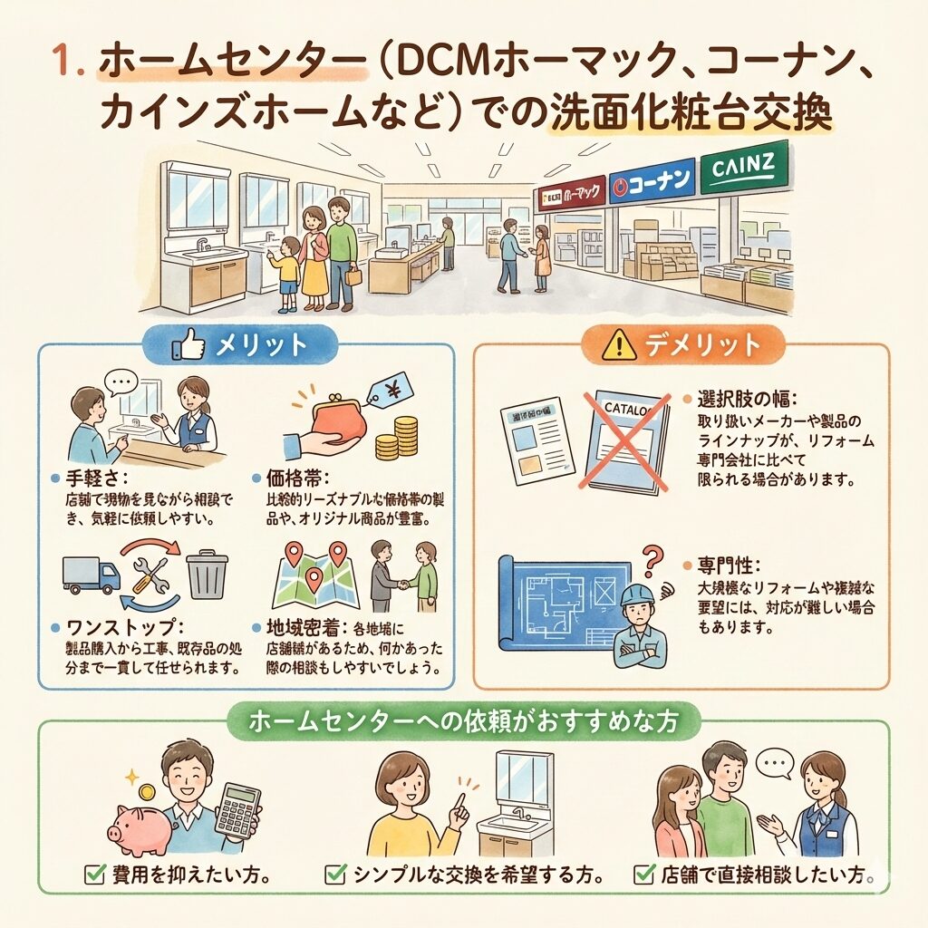 DCMホーマックをはじめとするホームセンターは、洗面化粧台交換の身近な依頼先として人気があります。