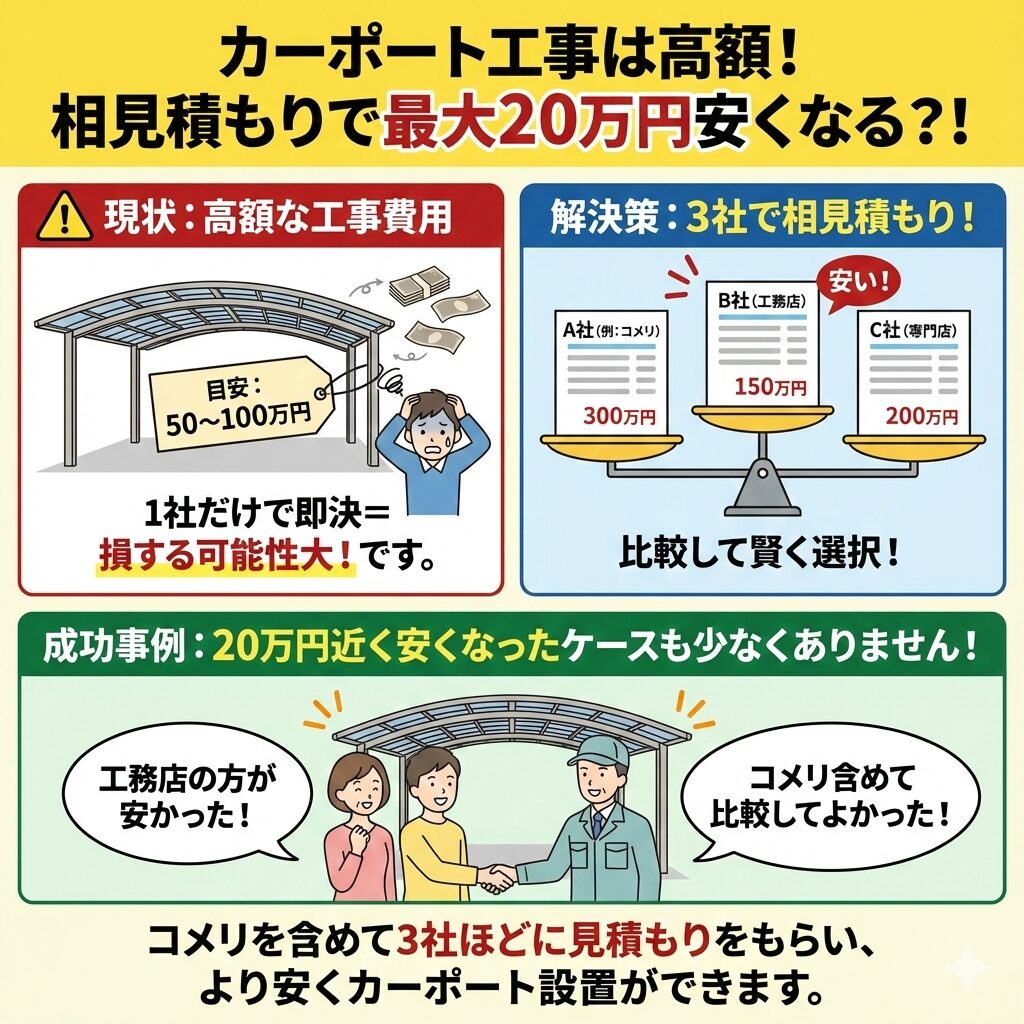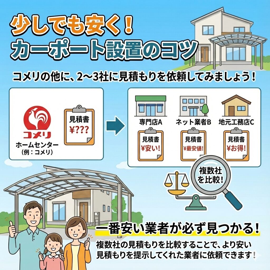 「少しでも安くカーポートを設置したい」という場合は、コメリの他に、2〜3社に見積もりを依頼してみましょう!