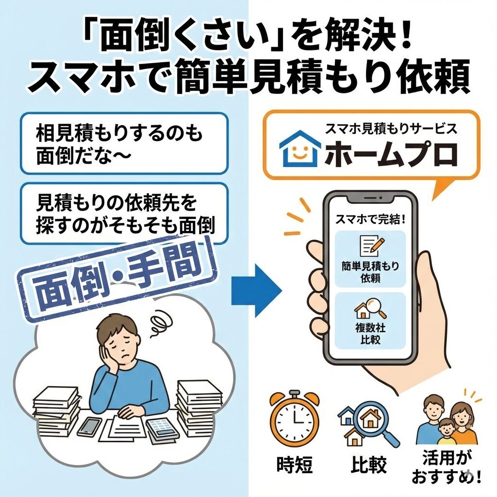 「相見積もりするのも面倒だな〜」「見積もりの依頼先を探すのがそもそも面倒」という人は、ホームプロ