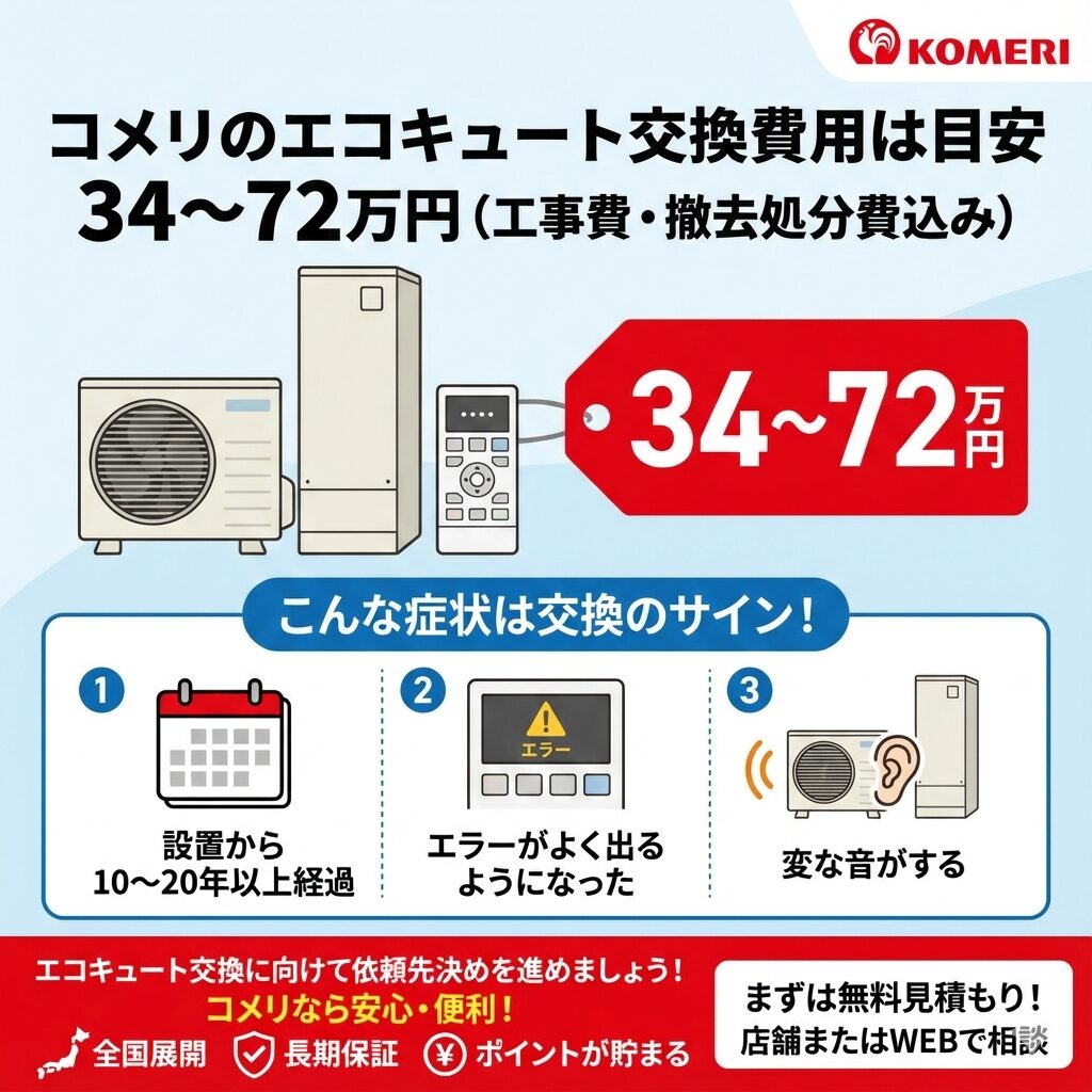 コメリのエコキュート交換費用は「34〜72万円」が目安です。