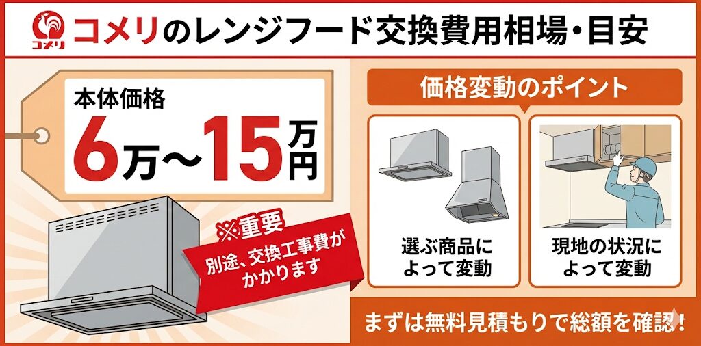 コメリのレンジフード交換の費用は「6万〜15万円」が相場です。