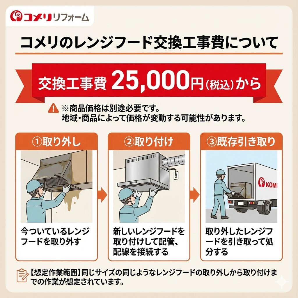 コメリのレンジフード交換費用は、商品価格とは別に必要です。コメリリフォームの公式HPには、交換工事費「25,000円(税込)から」と記載されていますが、地域・商品によって価格が変動する可能性があります。
