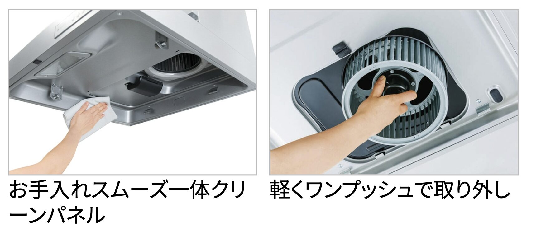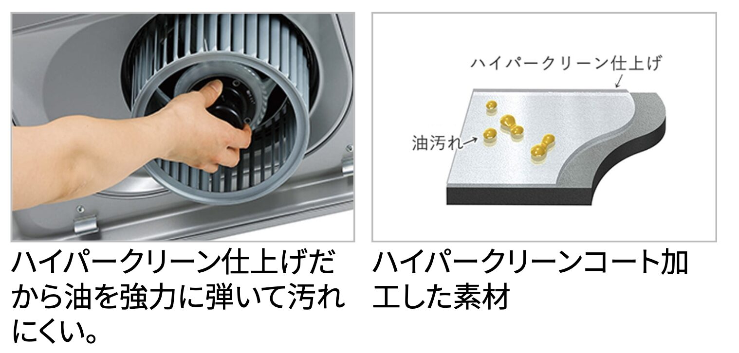 多くのモデルでノンフィルター構造を採用しており、面倒なフィルター掃除が不要です。整流板やファンには油汚れを弾くコーティング(ファンシークリーンなど)が施され、日常のお手入れは拭き掃除が中心で済みます。さらに、DCモーターやLED照明で省エネを実現し、コンロ連動機能や自動風量制御など便利な機能も搭載しています。