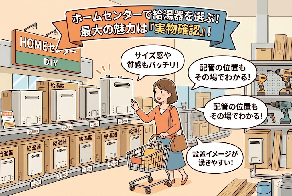 ホームセンターの最大の魅力は、実際に給湯器を目で見て確認できることです。