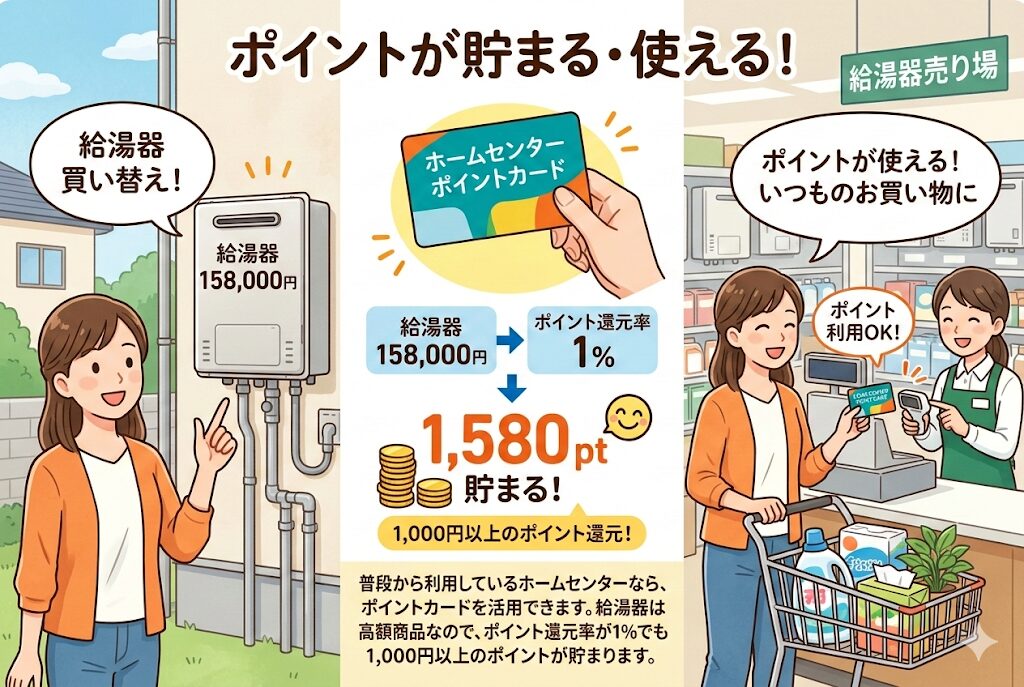 普段から利用しているホームセンターなら、ポイントカードを活用できます。給湯器は10万円を超える高額商品なので、ポイント還元率が1%でも1,000円以上のポイントが貯まることになります。