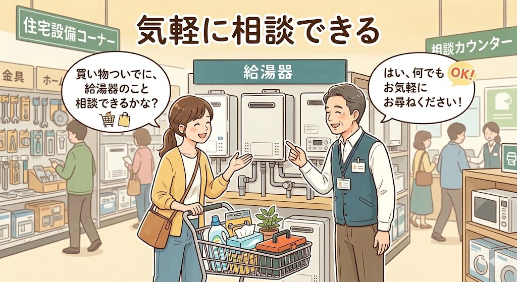 「給湯器専門業者に問い合わせるのはハードルが高い」と感じる方でも、普段から利用している店舗なら相談しやすいでしょう。
