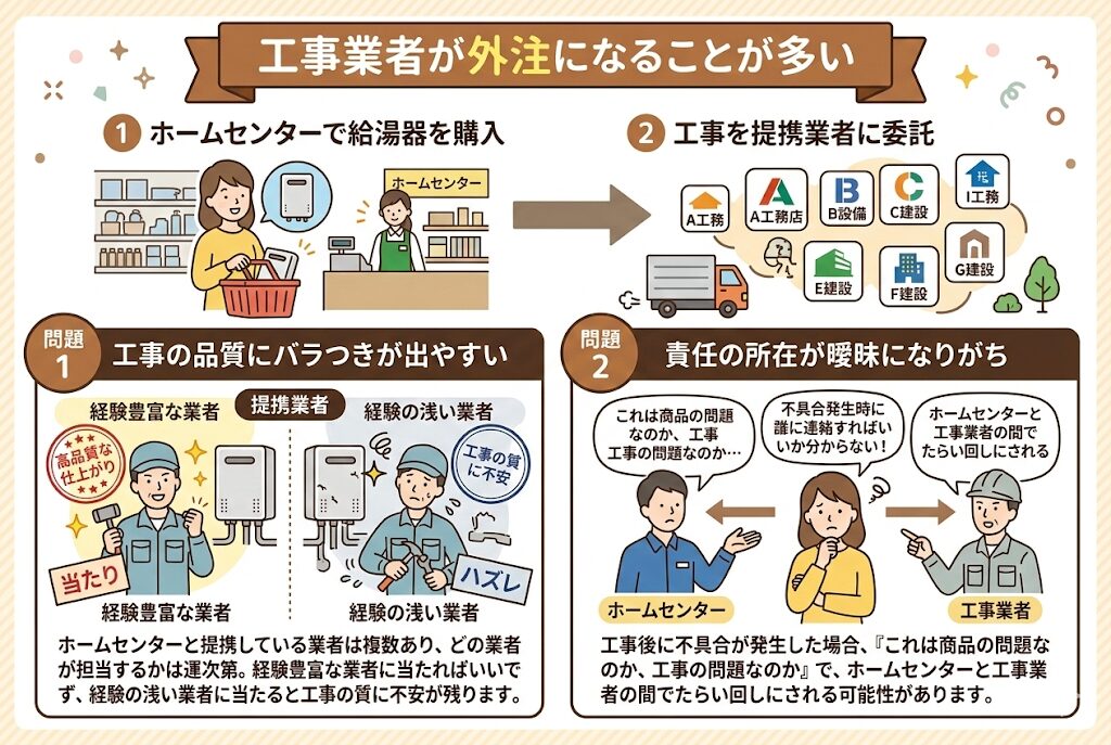 ホームセンターで給湯器を購入した場合、実際の取り付け工事は提携している外部業者に委託されるケースがほとんどです。これにより、以下のような問題が発生することがあります。
