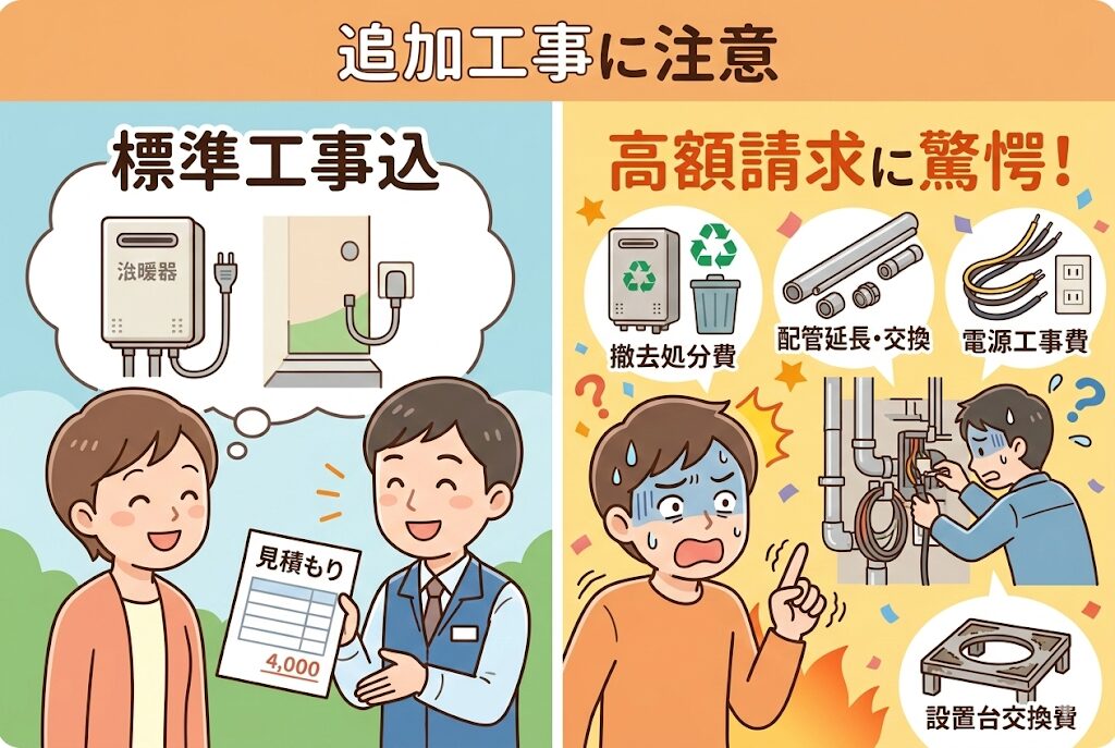 例えば、古い給湯器の撤去処分費用、配管の延長や交換、電源コンセントの増設、設置台の交換などは、追加費用として請求されることがあります。これらの費用は事前に明示されないことも多く、工事当日になって「あと3万円かかります」と言われて驚くケースも少なくありません。