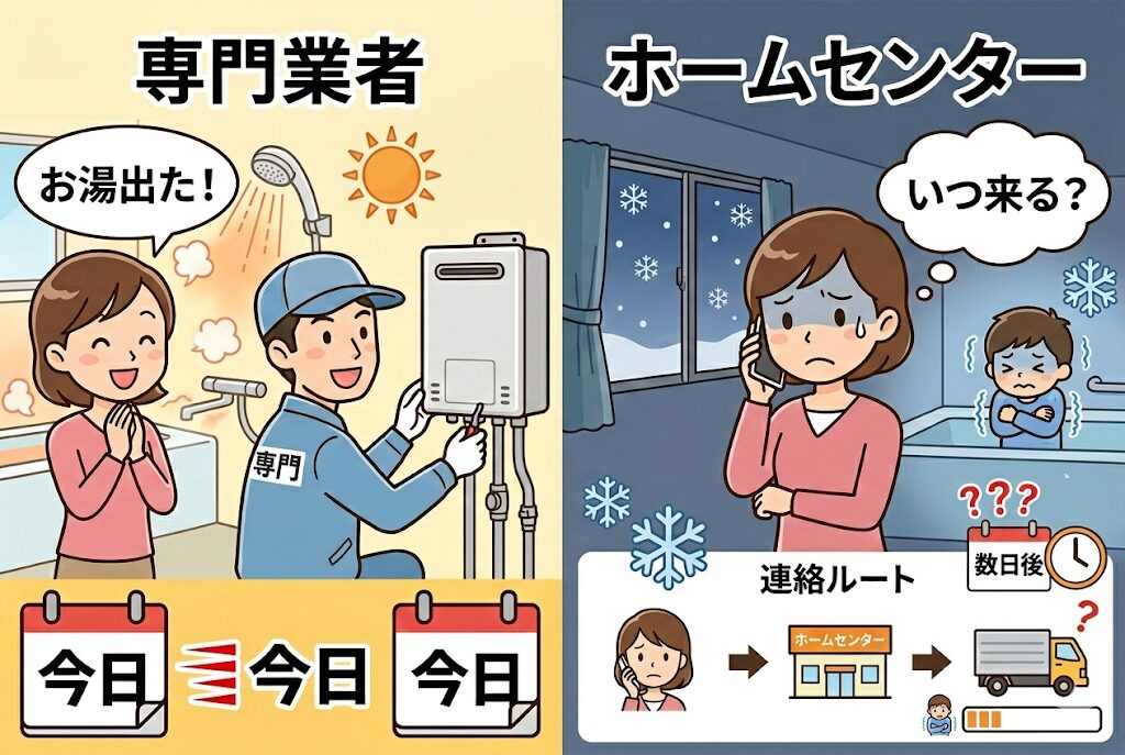 特に冬場にお湯が出なくなると、生活に大きな支障をきたします。専門業者なら即日対応してくれることもありますが、ホームセンター経由では数日待たされることも珍しくありません。