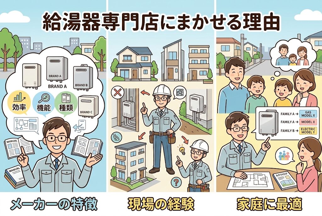 給湯器の知識が少ない方や、トータルコストを抑えたい方、充実したアフターサービスを求める方には、専門業者への依頼がおすすめです。複数の業者から見積もりを取り、実績や口コミ、保証内容をしっかり比較して、信頼できる業者を選びましょう。給湯器は10年以上使う重要な設備です。目先の安さだけでなく、長期的な安心を重視した選択をすることが、後悔しないためのポイントです。