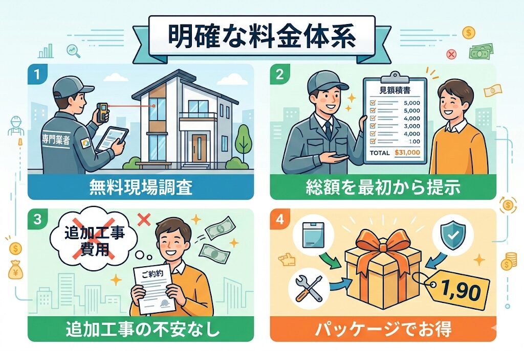 専門業者の多くは、最初から追加工事の可能性も含めた見積もりを出してくれます。現場調査を無料で行い、必要な工事をすべて洗い出した上で総額を提示するため、後から予想外の費用が発生することが少ないです。