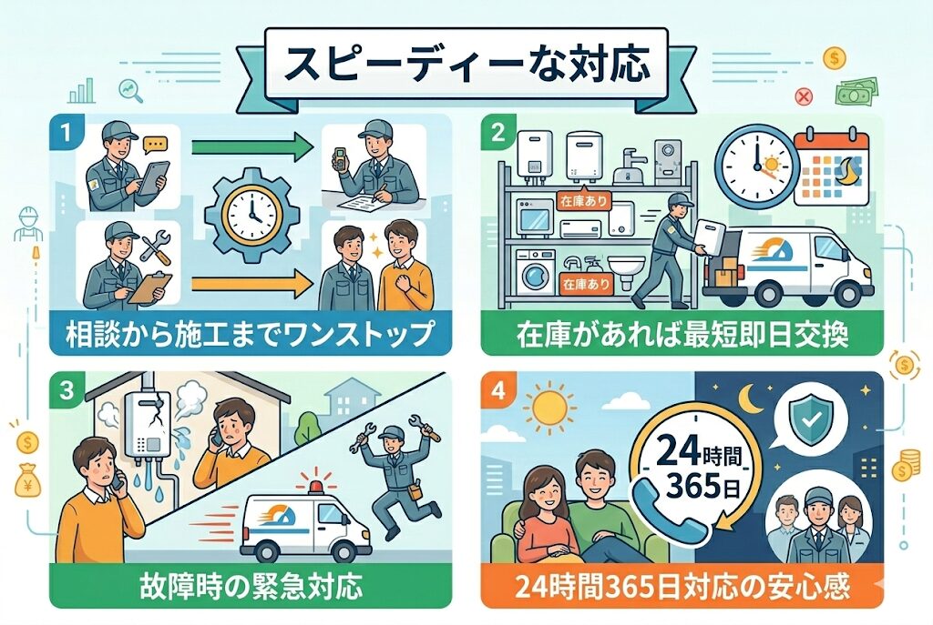 専門業者は自社で工事まで完結できるため、相談から施工までがスムーズです。在庫があれば最短即日で交換してくれる業者もあります。