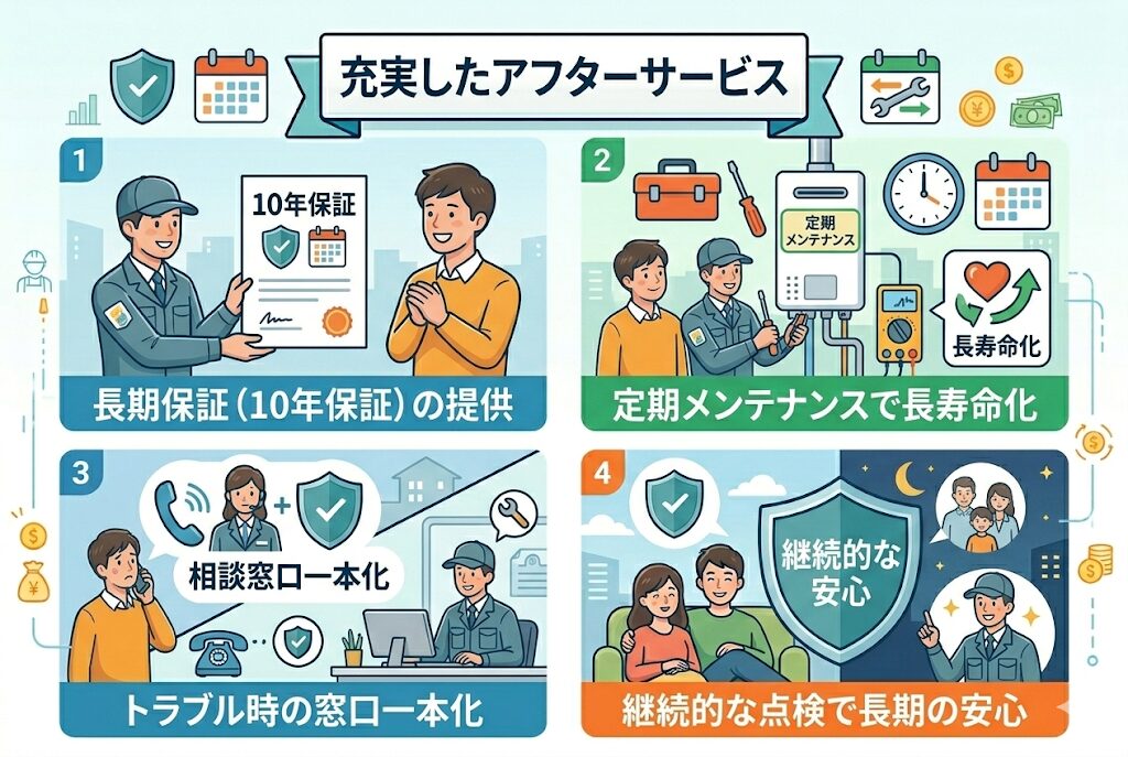 メーカー保証だけでなく、工事保証や独自の延長保証があるかを確認しましょう。保証期間は何年か、無償修理の範囲はどこまでか、出張費用は保証に含まれるかなど、細かい条件をチェックすることが重要です。