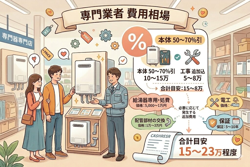 ただし、古い給湯器の処分費(5,000〜1万円)、配管部材の交換(1万〜3万円)、設置台の交換(1万〜2万円)、電源工事(1万〜3万円)などの追加費用が発生する可能性があります。