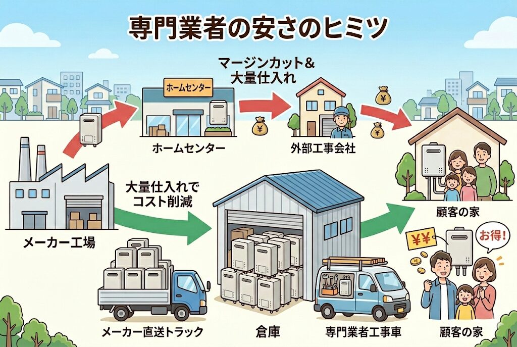給湯器を専門に扱う業者は、メーカーから大量に仕入れるため、1台あたりの仕入れ価格を大幅に下げられます。