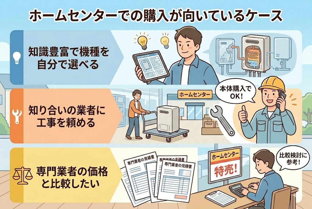 ホームセンターでの購入が向いているケースもあります。給湯器に関する知識が豊富で、自分で最適な機種を選べる人や、知り合いの工事業者がいて直接依頼できる人は、ホームセンターで本体だけ購入するのも一つの方法です。