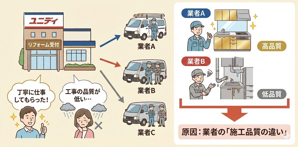 契約先はユニディですが、実際に施工するのはユニディが手配した提携業者(下請け)です。依頼主が特定の職人や業者を指名することは基本的にできません。そのため、当日来る業者の技術力やマナーによって、工事の品質や満足度に差が出ることがあります。不安な場合は、事前に「どのような基準で業者を選定しているか」を確認しておくと良いでしょう。