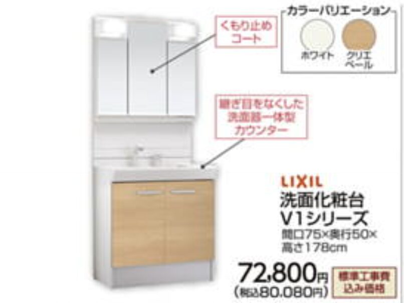 DCMの「リフォームカタログ_東北版(2025年9月1日発行)」の中で、1番安い洗面台は、上記の写真の商品です。工事費は商品価格に含まれており「80,080円(税込)」で依頼できます。