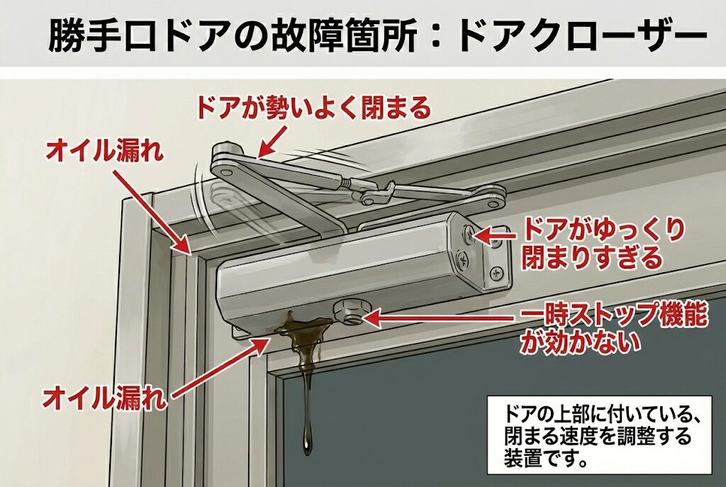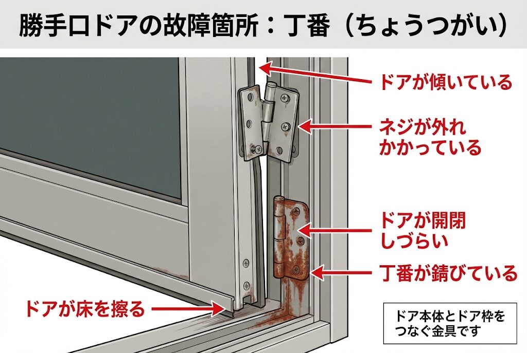 勝手口ドアの丁番が外れた、鍵がかからない、ドアクローザーから油が漏れている…こんなトラブルが起きても、どこに修理を依頼すればいいか分からず困っている方は多いはずです。