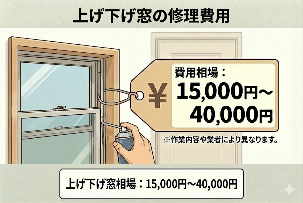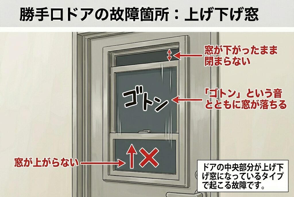 ドアの中央部分が上げ下げ窓になっているタイプで起こる故障です。