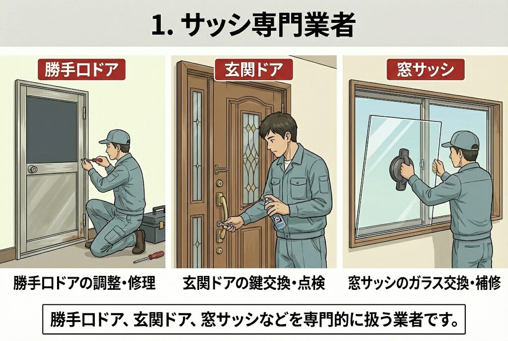 勝手口ドア、玄関ドア、窓サッシなどを専門的に扱う業者です。