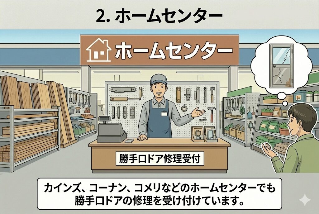 カインズ、コーナン、コメリなどのホームセンターでも勝手口ドアの修理を受け付けています。