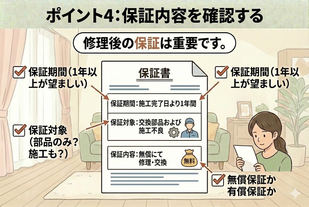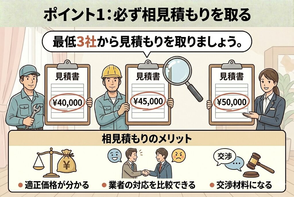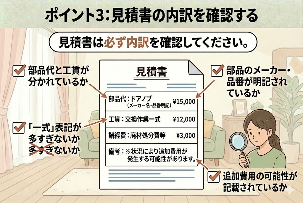 故障箇所が特定できれば、業者に説明しやすくなり、見積もりも正確になります。