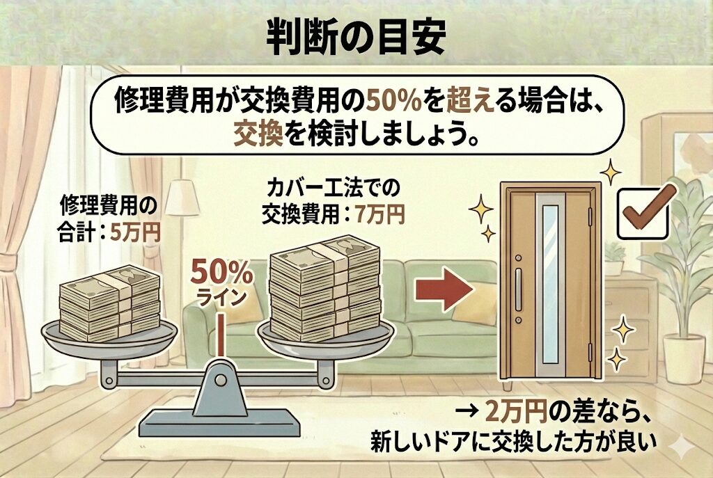 修理費用が交換費用の50%を超える場合は、交換を検討しましょう。