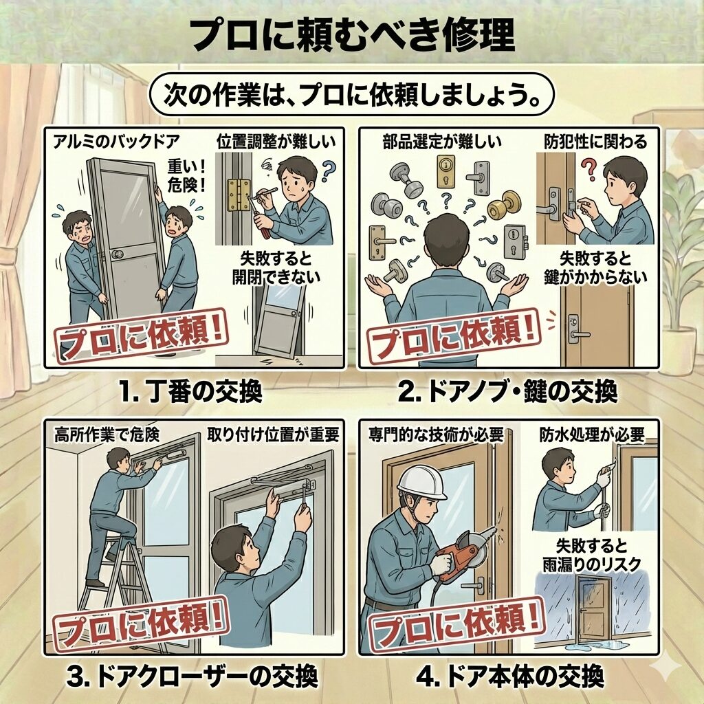 「勝手口ドアが壊れたけど、どこに修理を頼めばいいの?」「ホームセンター、リフォーム会社、専門業者…何が違うの?」