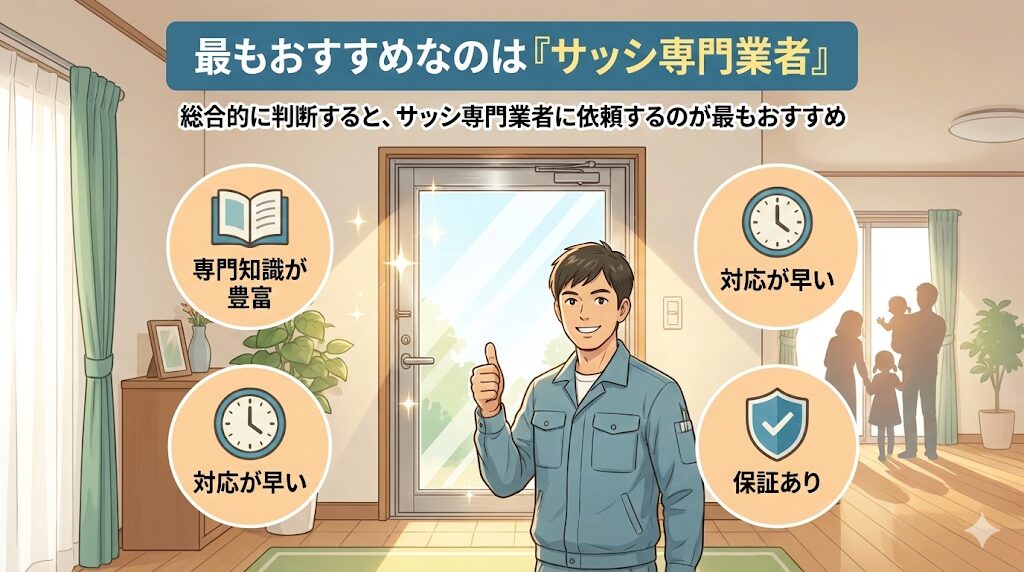 総合的に判断すると、サッシ専門業者に依頼するのが最もおすすめです。