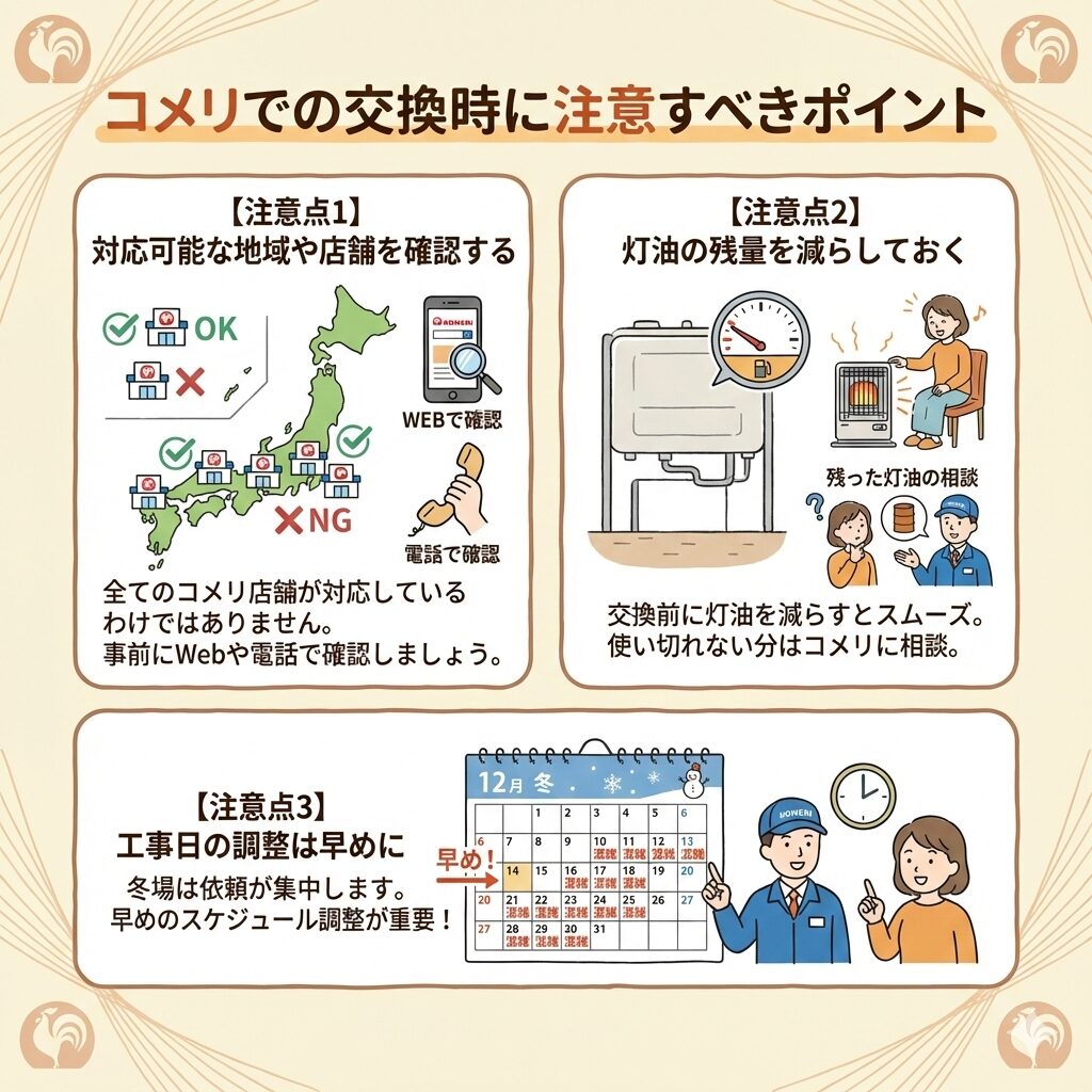 Webに目安となる金額は記載されておらず、現地の状況やオイルタンクの大きさ・状態により金額が異なるとなっているので、事前にコメリに確認して依頼しましょう。