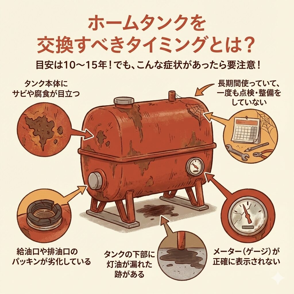 特にサビや漏れは、灯油の環境汚染や火災リスクにつながる重大なトラブルになりかねません。安全のためにも、定期的な点検と適切なタイミングでの交換を心がけましょう。