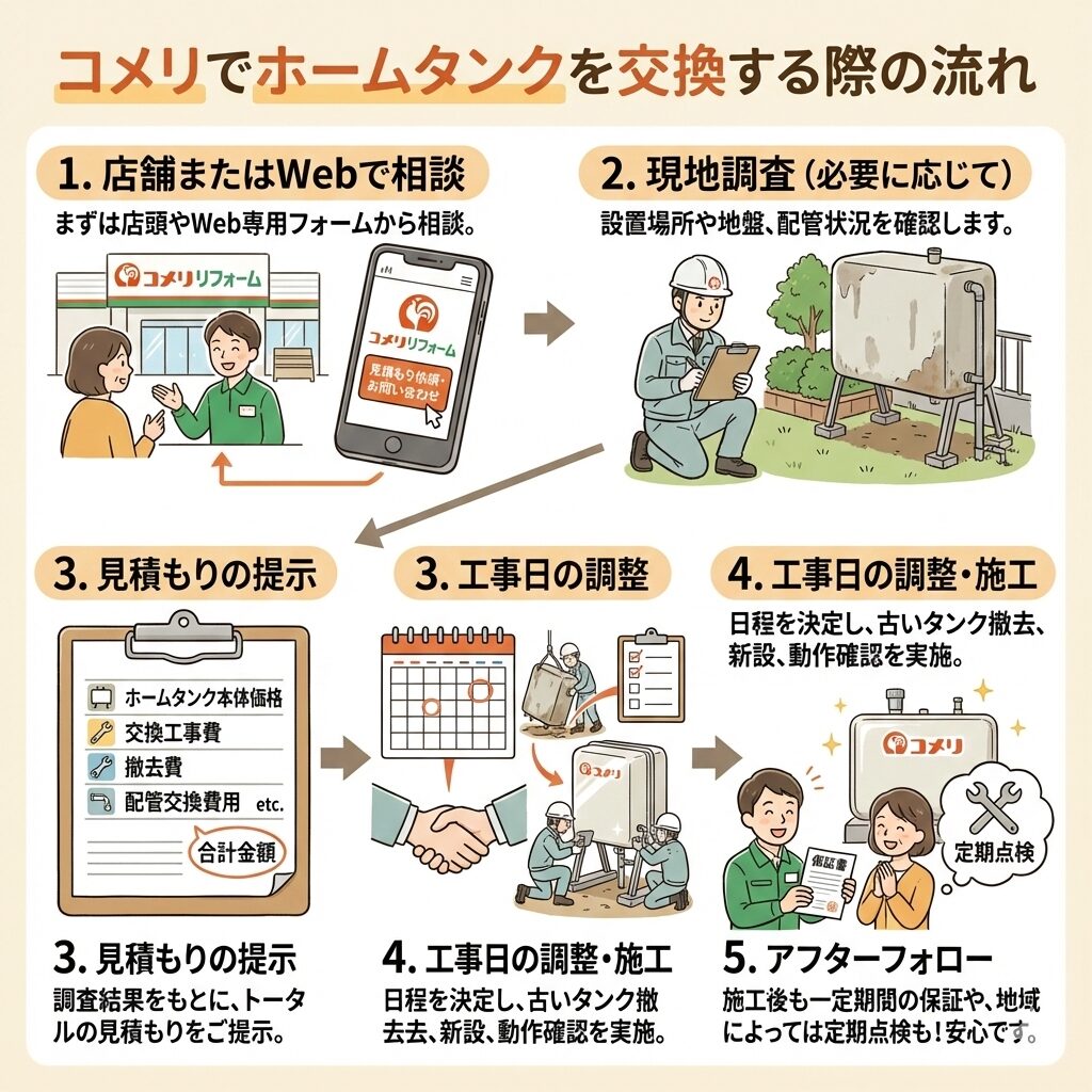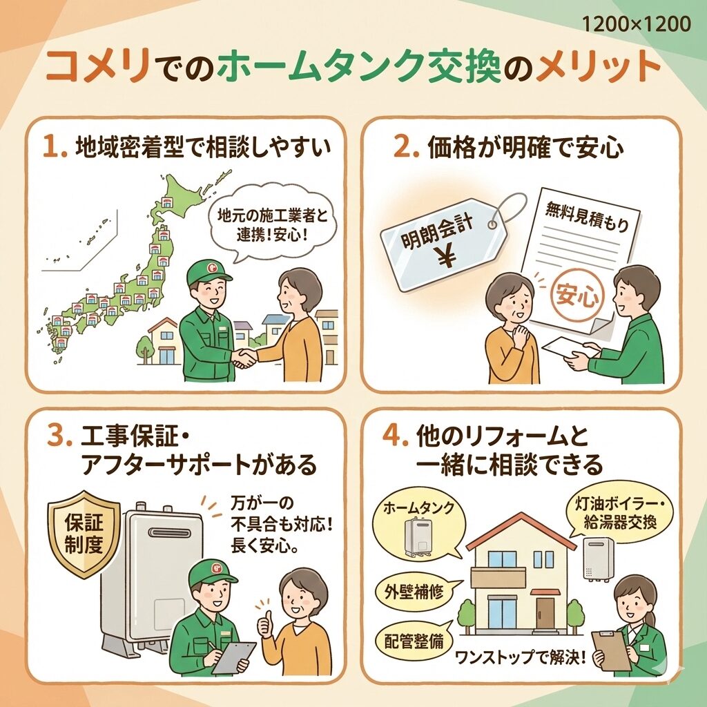 コメリはホームタンク交換の対応が可能で、本体の購入と既存のホームタンクとの交換工事まで、まとめて依頼できます。よく利用している方であれば、馴染みがあり、安心して依頼できます。