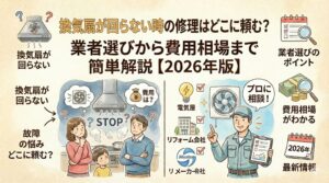 「ブーン」「ブオーン」の音が異常に大きい場合は、ファンモーターが故障しかけている可能性があります。近所に聞こえるほど大きな音がする場合は、専門業者に相談しましょう。