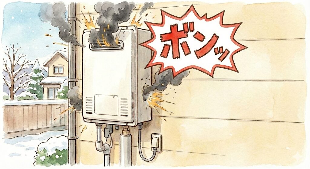 「ボンッ」という爆発音は最も危険な異音です。不完全燃焼やガス漏れが起きている可能性があり、一酸化炭素中毒や爆発の危険があります。直ちに使用を中止し、ガス会社または専門業者に連絡してください。