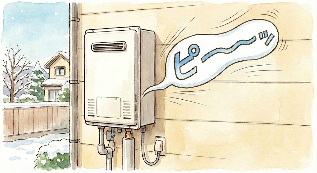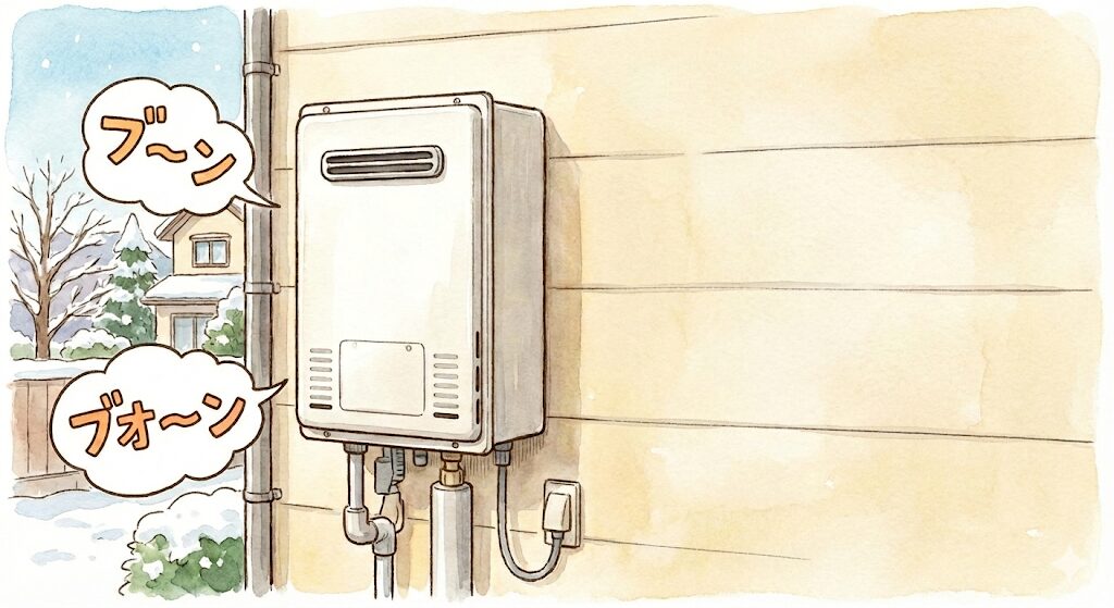 「ブーン」「ブオーン」という音は、給湯器内部のファンモーターが作動している音です。給湯器の点火直後や運転中に聞こえることが多く、冬場の凍結防止機能が作動している際にも発生します。音が一定で不規則でなければ、故障ではなく正常な動作です。