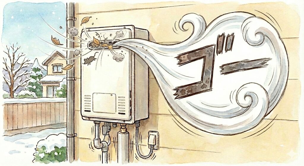 「ゴー」という音が排気口付近から聞こえる場合は、ゴミやホコリ、ネズミやセミなどの異物が混入している可能性があります。放置すると十分な給排気ができず、給湯器の能力低下や不完全燃焼を起こす危険があります。