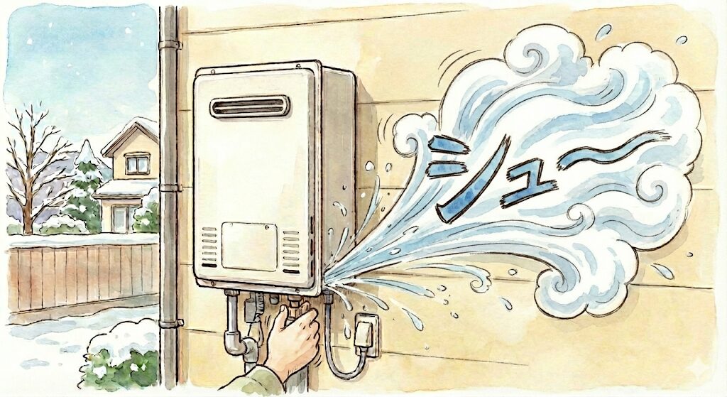 「ジュージュー」という音は、給湯器内部の結露が高温部分に触れて蒸発する際に発生します。ガスに含まれる水蒸気と外気の温度差によって結露が生じるため、問題ありません。