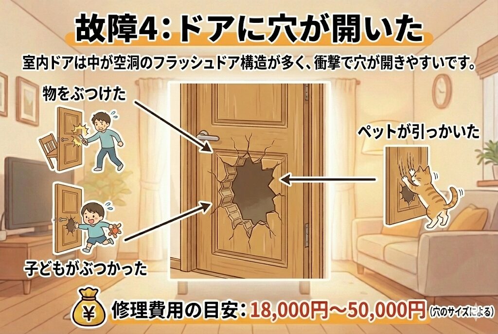 室内ドアは中が空洞のフラッシュドア構造が多く、衝撃で穴が開きやすいです。