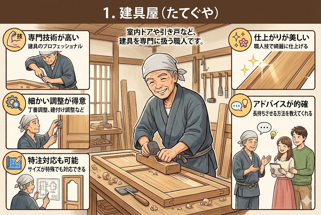 - 建具屋:専門技術が高い、仕上がりが美しい