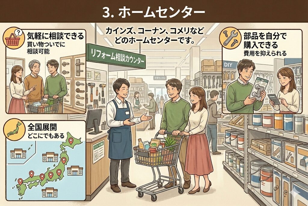 - ホームセンター:気軽に相談できる、中間マージンあり