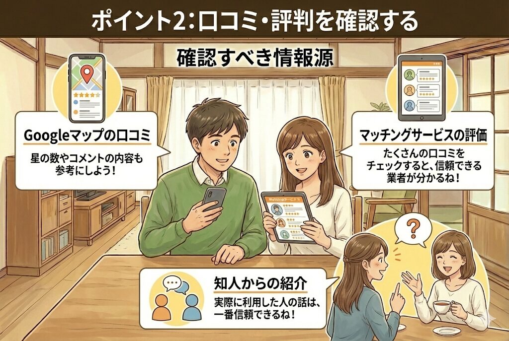 くらしのマーケットやミツモアなどでは、実際の利用者の口コミが見られるため、評価が高い業者を選べば安心です。