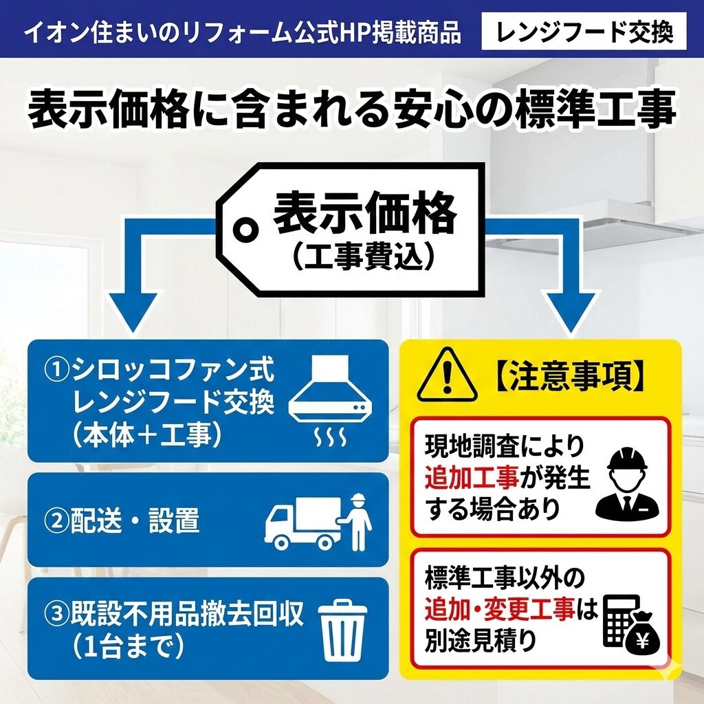 イオン住まいのリフォーム公式HPで掲載・販売されている商品を紹介していきます。レンジフードの交換工事費は、商品の表示価格に含まれています。